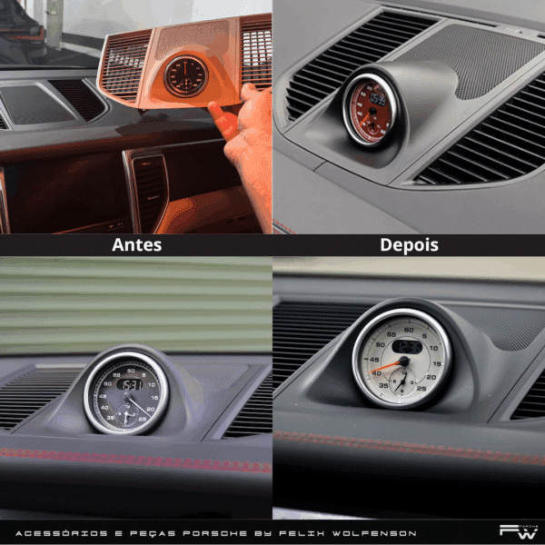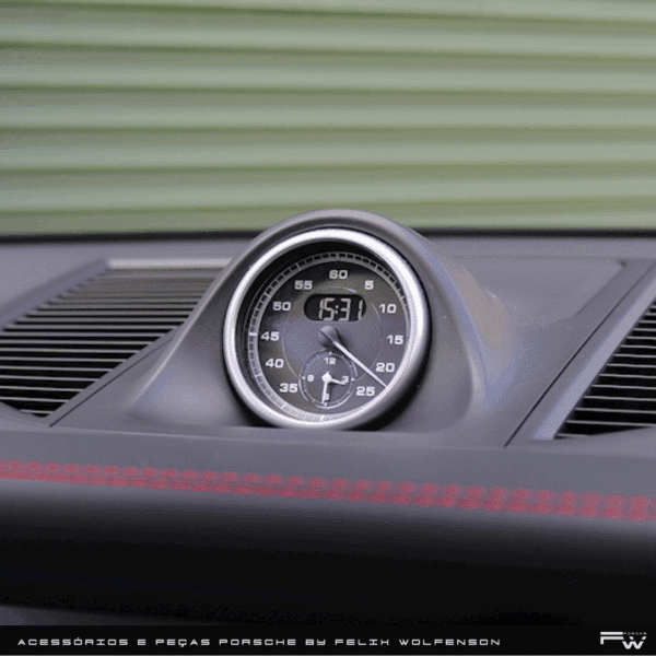 O Relógio Sport não ativa as funções de performance, mas entrega um visual luxuoso e esportivo do clássico relógio no Painel de seu Porsche demonstrando o temperamento da marca tornando o ambiente interior mais sofisticado.