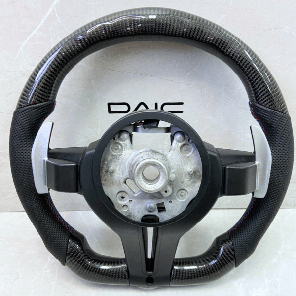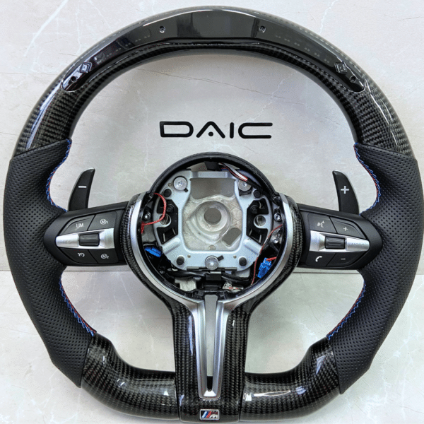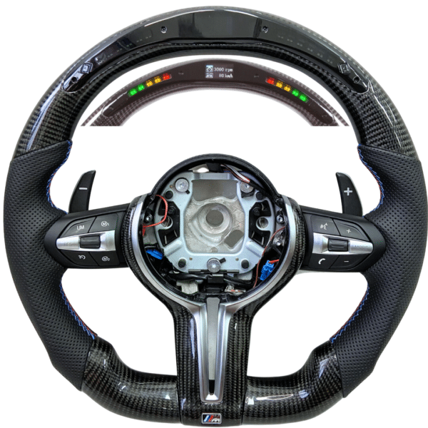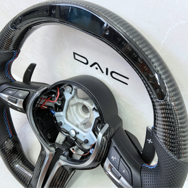 Volante modelo original BMW em fibra de carbono (real) + LED DISPLAY + revestimento em Couro com costura nas cores da M performance.